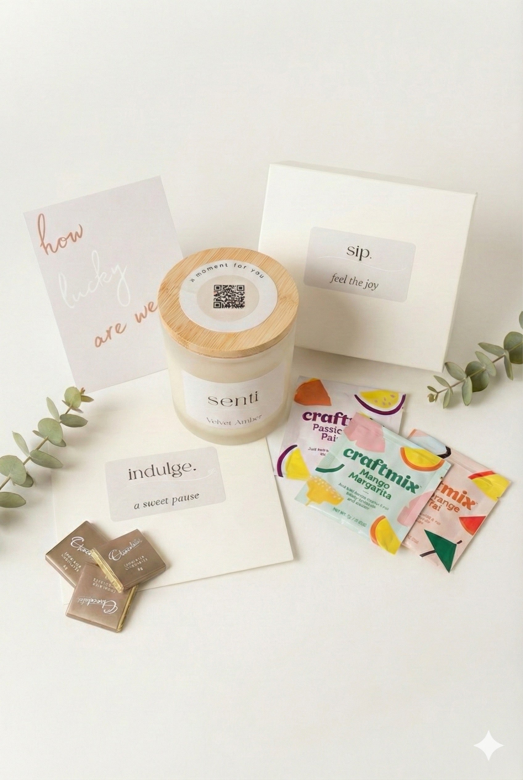 A joyful, feel-good gift box for birthdays, promotions, milestones and all the little wins. Curated with a premium senti candle, a fun mocktail moment, a gourmet chocolate square and two joyful keepsake prints. A warm, thoughtful way to celebrate someone special.